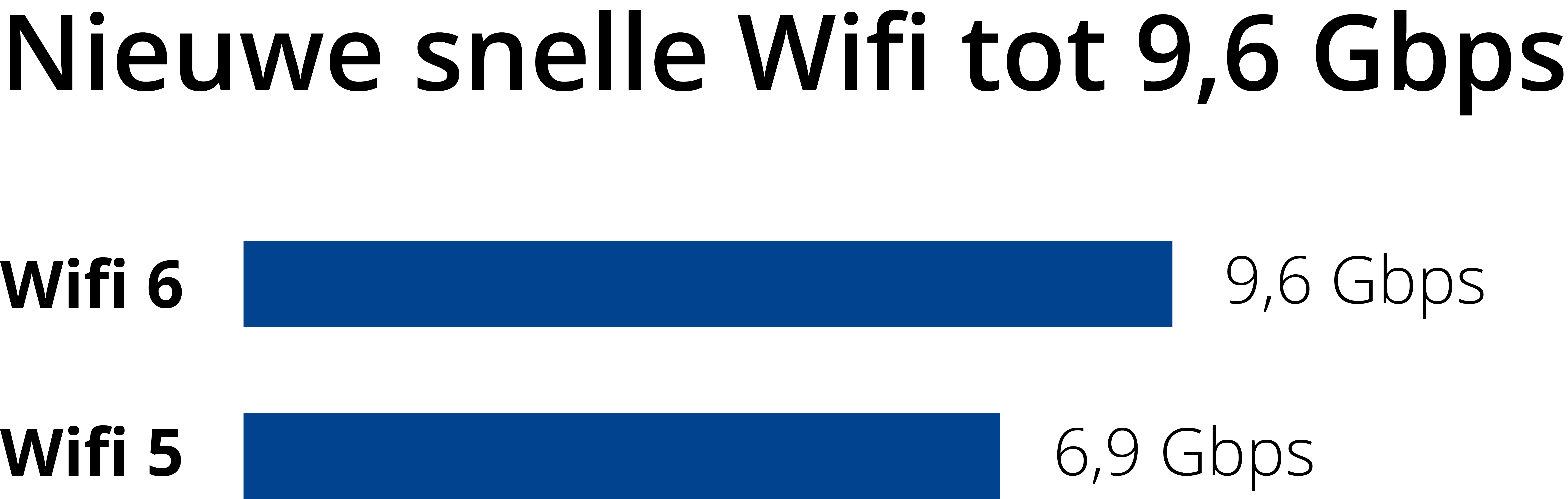 Wifi 6 is de nieuwste Wifi standaard die in 2019 werd gelanceerd en bevat een aantal technische verbeteringen. De nieuwe Wifi versie zorgt ervoor dat draadloze netwerken sneller zijn en heeft een grotere capaciteit dan zijn voorganger, Wifi 5 (802.11ac). Dat wil zeggen dat wanneer u meerdere apparaten tegelijk aansluit, u geen snelheid verliest.